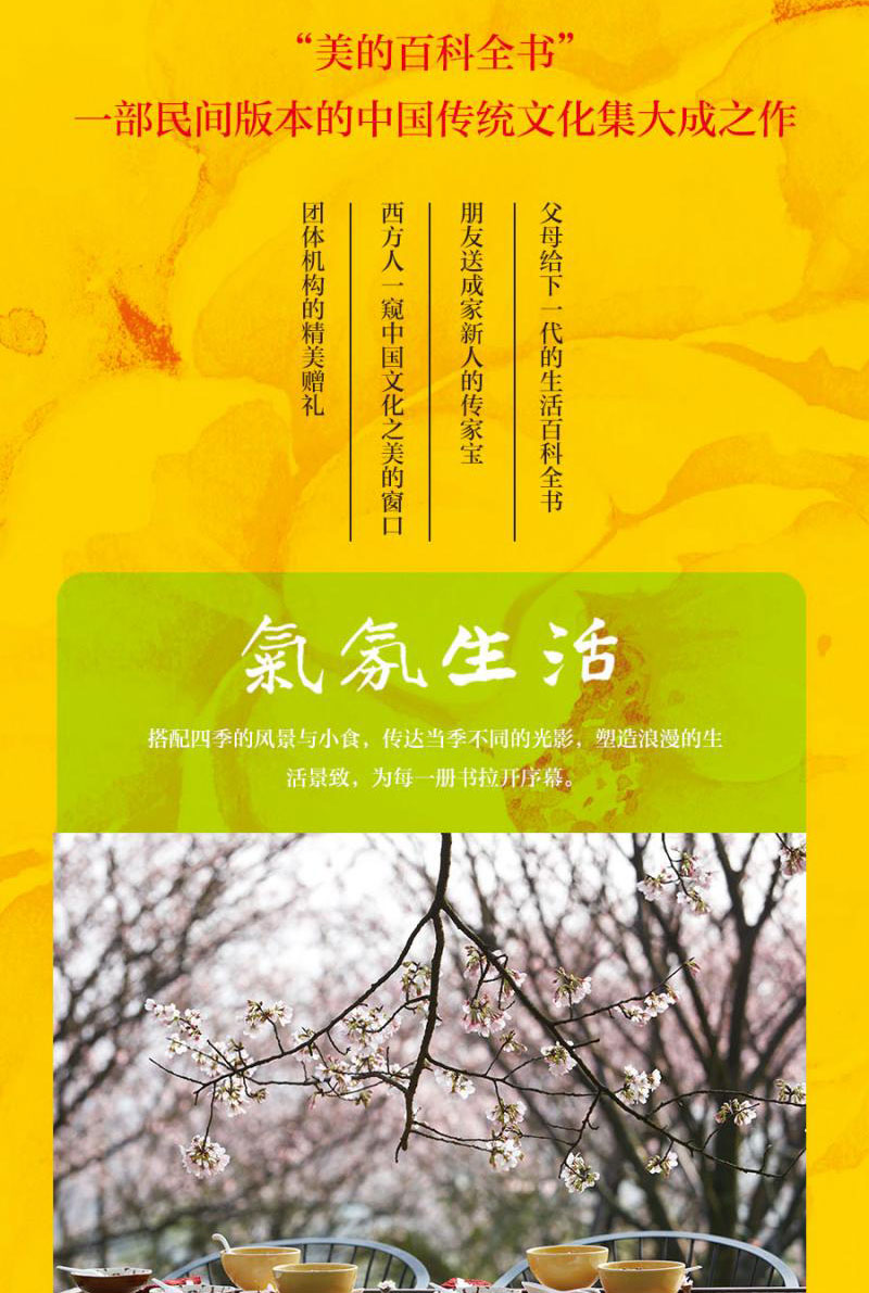 全書分春、夏、秋、冬四卷呈現中國人的生活智慧,每本內容都以“氣氛生活”“歲時節慶”“以食為天”“匠心手藝”“齊家心語”“生活札記”六個單元,用文字、圖像與生活結合的方式展現日常生活的中國文化精粹。 “氣氛生活”是運用每個季節不同的光影來讚美這個季節;“歲時節慶”介紹中國人的傳統節日,介紹慶典的由來、怎麼吃、怎麼玩等等;“以食為天”是全書所佔分量重,分主食、文化食物和零食三個單元來介紹,包括了米、面、蔬菜、肉類的製作手法,以及茶、酒的分類等等;“匠心手藝”部分則著眼於生活四周任何跟生活有關的手藝,以現代的手法介紹傳統藝術的特質,如插花、女紅、服飾等等;“齊家心語”以動情的文字挖掘家族秘密,再現中國人的歷史悲情,並與家庭成員分享生活哲學、相處之道與愛意傳達;同時蒐集整理了中國人的詩詞、成語諺語、戲曲列表、格言等,很有實用價值。 “生活札記”部分主要介紹現在的生活,包括了種菜買菜、飲食、家計等。