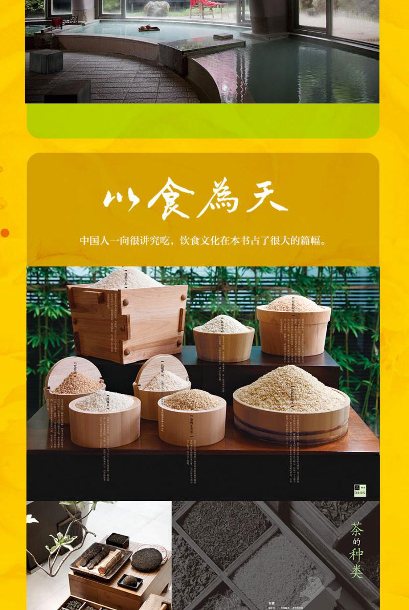 中國人一向很講究吃,飲食文化在本書佔了很大的篇幅,分別以主食、文化食物與零食三種方式介紹;有的以做法粗分類別,有的則龐雜如百科全書。 “食物”篇提供的是分類方法,視覺效果,家傳食譜,民間食補,以及常用的中醫藥膳。