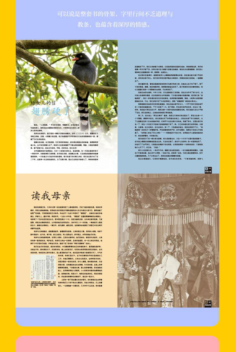 “齊家心語”篇的設計,可以說是這整套書的骨架,字裡行間不乏道理與教條,也蘊含著深厚的情感:是身為母親,與兒女的教育對話;身為兒女,與上一代的感恩對話;身為妻子,與先生的愛情對話。