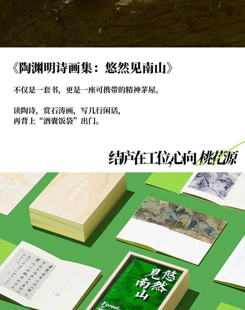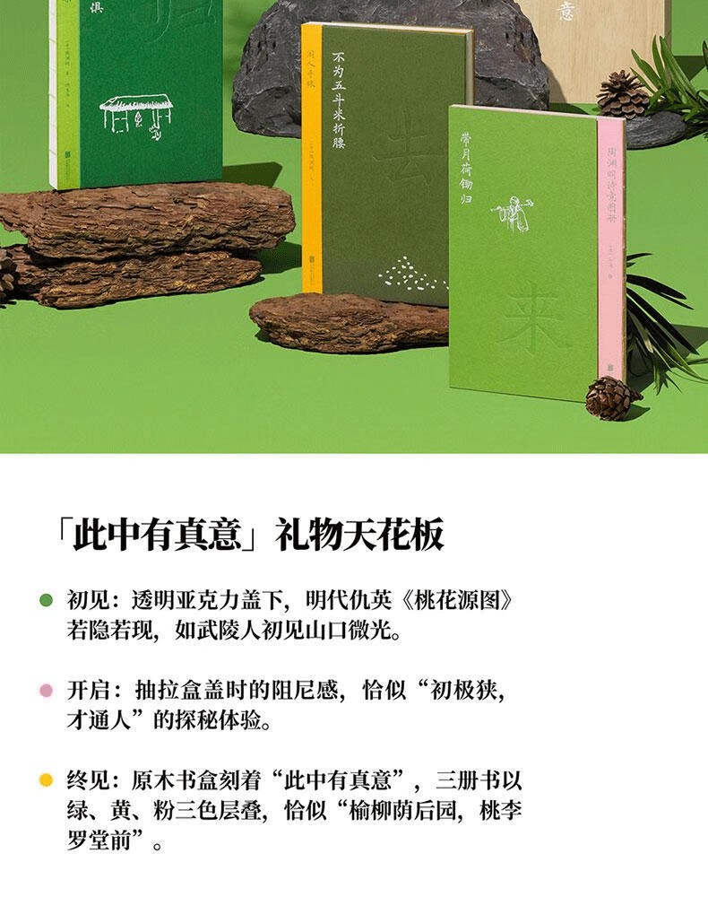 森林綠的壓克力盒蓋如同青山上的薄霧,明代仇英的《桃花源圖》若隱若現,如武陵人初見山口微光。抽拉盒蓋+手工雕刻木盒,還原「初極狹,才通人」的桃源入口感,拉開盒蓋,三冊書從淺碧到墨綠,層層疊疊展現出田園的生機與活力。