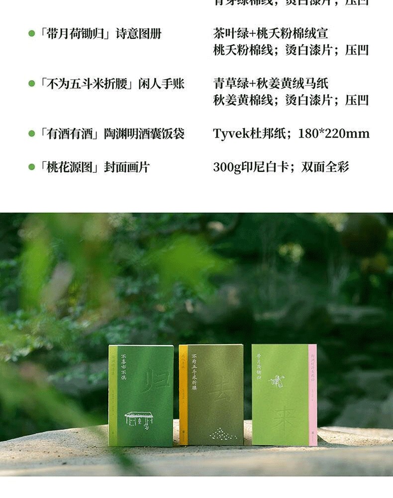 三冊小書的封面燙印著「歸去」三個字,裸脊鎖線的設計可讓書完全平攤,翻閱時彷彿能與陶公一同坐在籬笆前。內頁選用三款特用紙,以青芽綠、桃夭粉、秋薑黃棉線穿引,指尖觸碰之處,皆是滿滿的詩意。