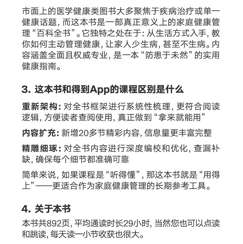 重預防:這不是一本「生病了怎麼辦」的醫學書,而是一本「怎樣讓全家人少生病、不生病」的生活指南。它教你的不是如何治病,而是如何透過改善生活方式,為全家人築起一道堅固的健康防線。