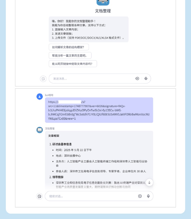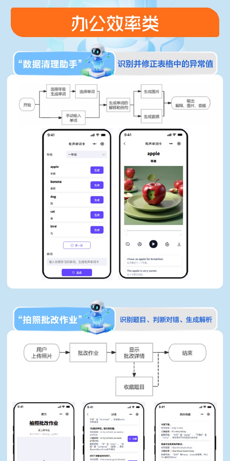 從文件整理、文案仿寫、熱門寫作等文案創作類應用,到資料清理、PPT 產生、行銷海報設計等辦公效率工具,再到智慧客服、會議室預約、有聲單字卡、拍照批改作業等場景化服務,全面涵蓋企業辦公、教育學習、商業行銷等高頻率需求。