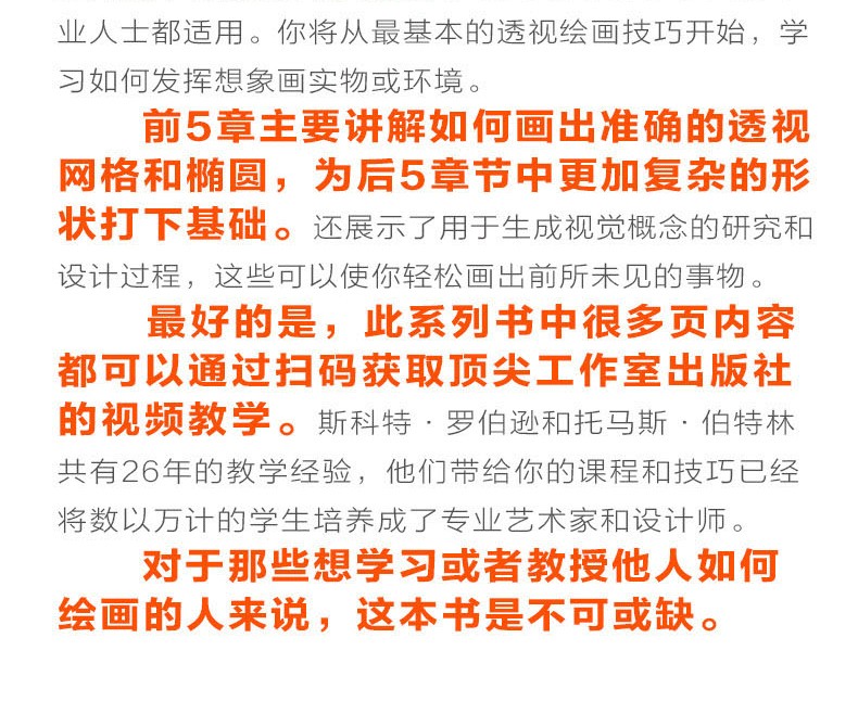 本書是行業專家對各種產品數字手繪設計做的詳細介紹,其精美詳細的手繪技法講解和步驟展示代表了 水平、 潮流,對產品設計初學者及提高者均有極高的學習和參考價值。同時為了給讀者帶來 有效的學習體驗,本書作者在關鍵知識點章節中配備了對應的講解和手繪視頻,掃碼即可獲取。斯科特?羅伯森和托馬斯?伯特林擁有30年以上教學經驗,他們帶來的專業課程和實用技巧已經過數以萬計學生、專業藝術家和設計師的實踐考證。對於那些想學習工業設計手繪表達的人來說,本書必不可少。